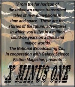 _____________________________________ X MINUS ONE was an NBC science fiction series that was an extension, or revival, of NBC's earlier science fiction series, DIMENSION X. which ran from Apr. 8, 1950 through Sept. 29, 1951. Both are remembered for bringing really first rate science fiction to the air. The first X MINUS ONE shows used scripts from DIMENSION X, but soon created new shows from stories from the pages of Galaxy Magazine. A total of 125 programs were broadcast, some repeats or remakes, until the last show of Jan. 9, 1958. 55/04/22 0 And the Moon Be Still as Bright (Ray Bradbury) 55/04/24 1 No Contact (George Lefferts) 55/05/01 2 The Parade (George Lefferts) 55/05/08 3 Mars Is Heaven (Ray Bradbury) 55/05/15 4 Universe (Robert Heinlein)