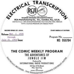 35/11/02 1 In the Cafe - 63703. The Adventures Of Jungle Jim. November 2, 1935. Program #1. Hearst syndication. Sponsored by: The Comic Weekly. Jungle Jim meets Miss Chalmers and the adventures of "The Bat Woman" begins. Jacques LaBarr gets into a barroom fight with Jungle Jim. The series was produced by Langlois and Wentworth and transcribed by RCA. The early programs of "Front Page Drama," which were issued on the other side of the Jungle Jim transcriptions, freqently ended with a credit for the announcer, "Wentworth." Matt Crowley (Jungle Jim up to approximately 1938), Gerald Mohr (as Jungle Jim after approximately 1938), Franc Hale (Shanghai Lil), Juano Hernandez (Kolu), Gene Stafford (writer), Jay Clark (producer), Glenn Riggs (announcer, among others). 15:02. Audio condition: Very good to excellent. Complete. 35/11/09 2 A Fight To the Finish 35/11/16 3 A Woman of Mystery (Shanghai Lil) 35/11/23 4 Reverend Chalmers Escapes 35/11/30 5 The Vampire Bat35/12/07 6 Jim and Kolu Hit the Trail 35/12/14 7 Race With a Crocodile 35/12/21 8 Headhunters 35/12/28 9 Jim and Kola Arrive At Chalmers' Camp 36/01/04 10 Stalled On the Trail 36/01/11 11 Chalmers' Fate 36/01/18 12 In the Bat Woman's Country 36/01/25 13 Jim Is Captured 36/02/01 14 Jim and Chalmers Discuss Situation 36/02/08 15 A Strange Proposal of Marriage Discussed 36/02/15 16 Signal Sent To Kolu for Help 36/02/22 17 Kolu Captures Mamba 36/02/29 18 Mamba Questioned - Wedding Preparations 36/03/07 19 Lil and LaBarr Have Shootout 36/03/14 20 Shotgun Wedding 36/03/21 21 Life and Death 36/03/28 22 Farewell 36/04/04 23 Jim Visits Lo Tung At Hotel 36/04/11 24 Shanghai Lil Goes To Jim's Camp 36/04/18 25 Lo Tung Has Purple Triangle On Chest 36/04/25 26 Jim Takes a Chance