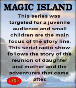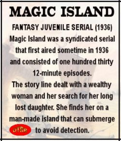 _____________________________________ MAGIC ISLAND was a syndicated serial that first aired sometime in 1936 and consisted of one hundred thirty 12-minute episodes. The story line dealt with a wealthy woman and her search for her long lost daughter. She finds her on a man-made island that can submerge to avoid detection. The series was targeted for a juvenile audience and small children are the main focus of the story line. 36/xx/xx 1 Jerry Hall's Proposal 36/xx/xx 2 Leaving LA for Magic Island 36/xx/xx 3 Strange Windstorm 36/xx/xx 4 Strange Bank of Fog 36/xx/xx 5 Tex Bradford Prepares His Straightoscope 36/xx/xx 6 Island in the Viewer36/xx/xx 7 Pulled by a Magnetic Force 36/xx/xx 8 Joan Is Found on Euclidia 36/xx/xx 9 G47 Uses His Ray Gun 36/xx/xx 10 False Radio Message 36/xx/xx 11 Island Secrets 36/xx/xx 12 Last Radio Message from Magic Island 36/xx/xx 13 Joan Stays on the Yacht 36/xx/xx 14 The Cloth Factory on the Island 36/xx/xx 15 Staged Escape Attempt 36/xx/xx 16 Soundproof Seaweed Cloth 36/xx/xx 17 Homing Pigeon 36/xx/xx 18 Pigeons Released 36/xx/xx 19 The Secret Formula 36/xx/xx 20 G47 Has the Pigeon & Formula 36/xx/xx 21 A Different Formula 36/xx/xx 22 Trapped in an Elevator 36/xx/xx 23 Elevator Escape