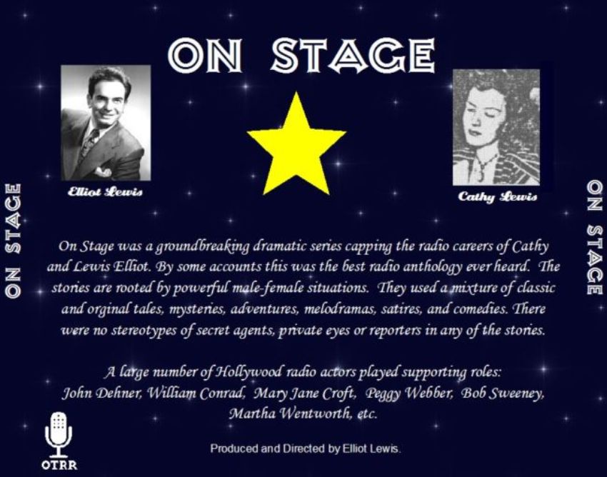 _____________________________________53/01/01 1 The String Bow Tie - The first show of the series. The handsome man in the subway ad. Cathy Lewis, Elliott Lewis, Sheldon Leonard, Mary Jane Croft. 53/01/29 5 Public Furlough - A bittersweet and brief romance between an army corporal and a movie star. Antony Ellis (performer, writer), Byron Kane, Cathy Lewis, Elliott Lewis 53/02/19 8 Four Meetings by Henry James - An innocent American school teacher finally visits Europe and is victimized by her cousin, departing after only thirteen hours! Elliott Lewis 53/02/26 9 A Fifth of Tears - A good story about an undercover policewoman trying to get evidence on a skid row bar thought to be employing "B-Girls," and a juvenile one at that! Barbara Whiting, Bob Sweeney 53/03/12 10 Call Me a Cab - A good love story about a lonely girl who takes a cab ride in the park. Beautiful daydreams. Cathy Lewis, Elliott Lewis 53/03/19 11 Eddie - An insane young man makes a "date" with a girl, despite a definite lack of interest on the part of the girl. Good radio! Cathy Lewis, Clayton Post 53/03/26 12 Dig, the Thief - A comedy about a carefree fraud who poses as a dishonest archeologist. Cathy Lewis 53/04/09 14 The Bunch of Violets - Cathy Lewis plays three different parts, wife, mother, secretary. A light comedy. Byron Kane, Cathy Lewis, Charlotte Lawrence 53/05/07 18 The Bear by Anton Chekhov - A western version of the classic short story, "The Boor." 53/05/14 19 Statement of Fact - A good story about an ambitious district attorney and his interview with a woman who has just murdered her husband with a hatchet. Byron Kane, Cathy Lewis 53/06/18 24 An Ideal Couple - The sad story of a seemingly happy marriage, told through the medium of a radio game show. Good radio writing! Cathy Lewis, Elliott Lewis 53/07/23 29 The Fling - A man with an invalid wife is tempted to have an affair with another, healthier woman. 53/11/18 44 A Circle of Wheels - A married couple both discover that they have little wheels growing inside their livers! An imaginative story. Cathy Lewis, Elliott Lewis, Whitfield Connor. 53/12/16 48 Candide by Voltaire - Candide and Dr. Pangloss discover that it is indeed the best of all possible worlds. Ben Wright, Byron Kane, Cathy Lewis _____________________________________