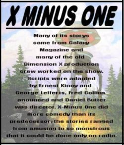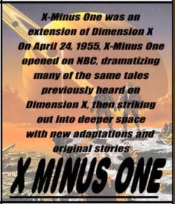 _____________________________________ X MINUS ONE was an NBC science fiction series that was an extension, or revival, of NBC's earlier science fiction series, DIMENSION X. which ran from Apr. 8, 1950 through Sept. 29, 1951. Both are remembered for bringing really first rate science fiction to the air. The first X MINUS ONE shows used scripts from DIMENSION X, but soon created new shows from stories from the pages of Galaxy Magazine. A total of 125 programs were broadcast, some repeats or remakes, until the last show of Jan. 9, 1958. 55/04/22 0 And the Moon Be Still as Bright (Ray Bradbury) 55/04/24 1 No Contact (George Lefferts) 55/05/01 2 The Parade (George Lefferts) 55/05/08 3 Mars Is Heaven (Ray Bradbury) 55/05/15 4 Universe (Robert Heinlein)